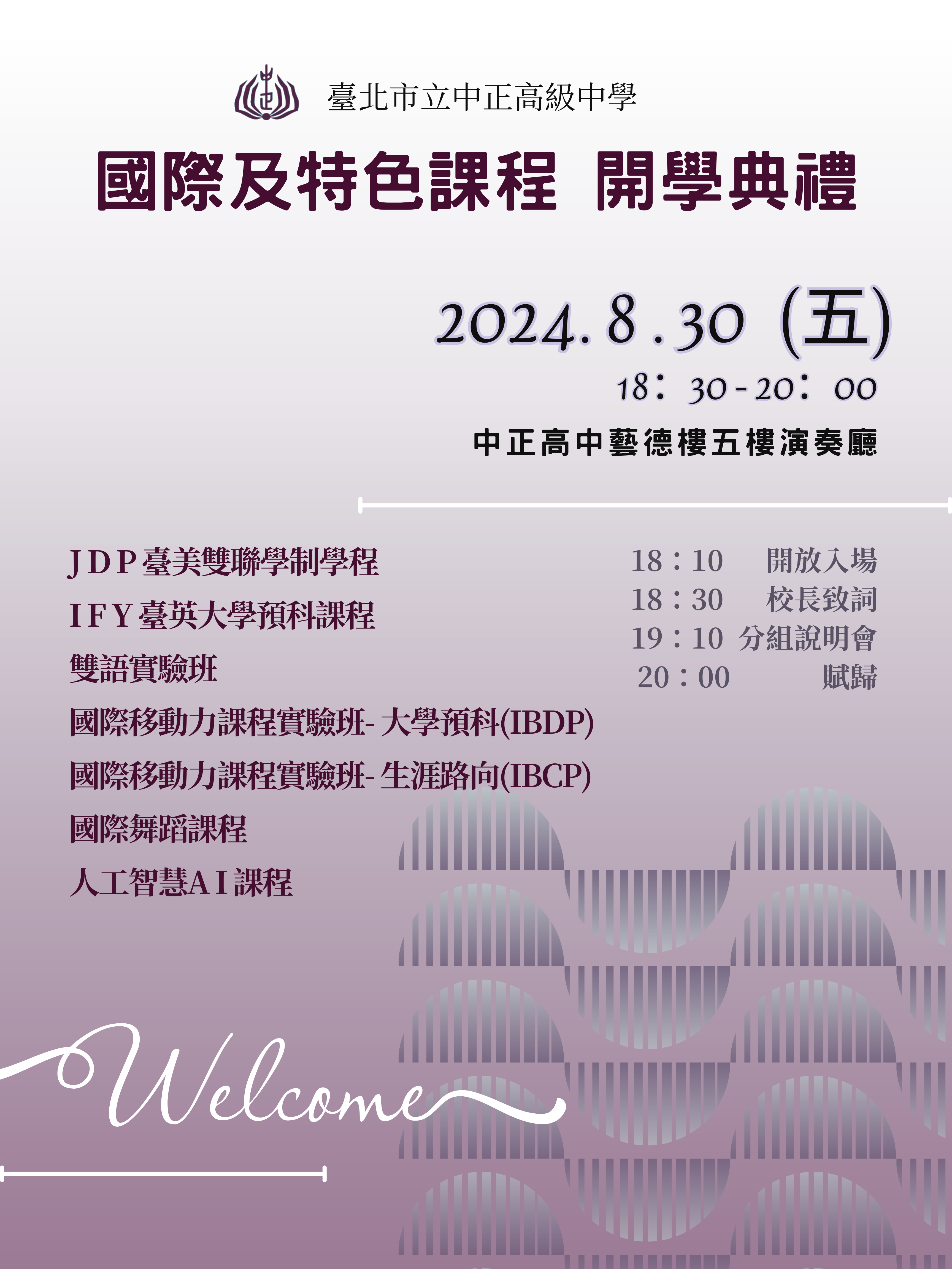 將於8月30日(星期五)18:30至21:00於中正高中藝德樓五樓演奏廳辦理雙聯學制(JDP)、臺英大學預科(IFY)、雙語實驗班、國際移動力課程實驗班:大學預科(IB-DP)、國際移動力課程實驗班:生涯取向(IB-CP)、國際舞蹈以及人工智慧AI課程等學程之開學典禮