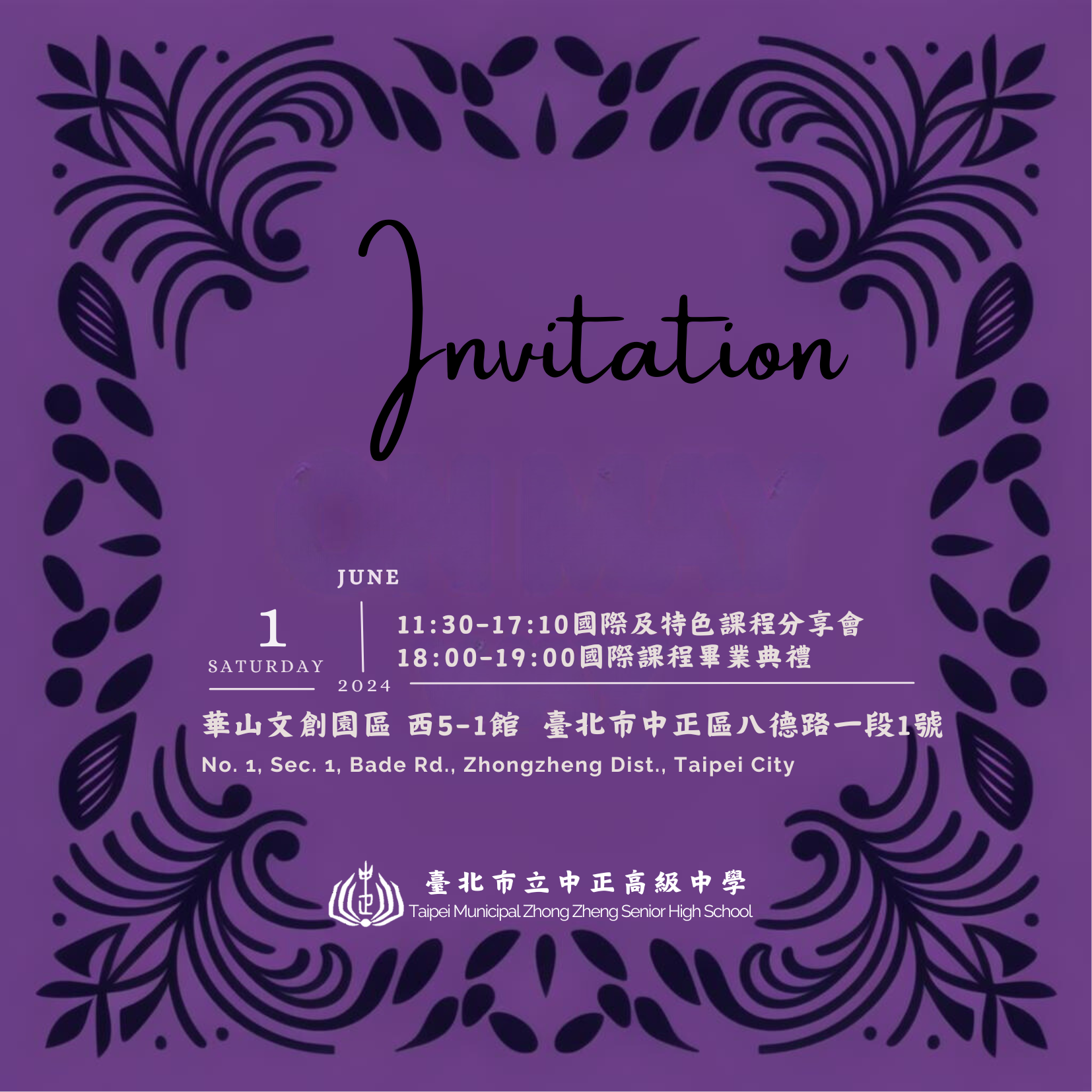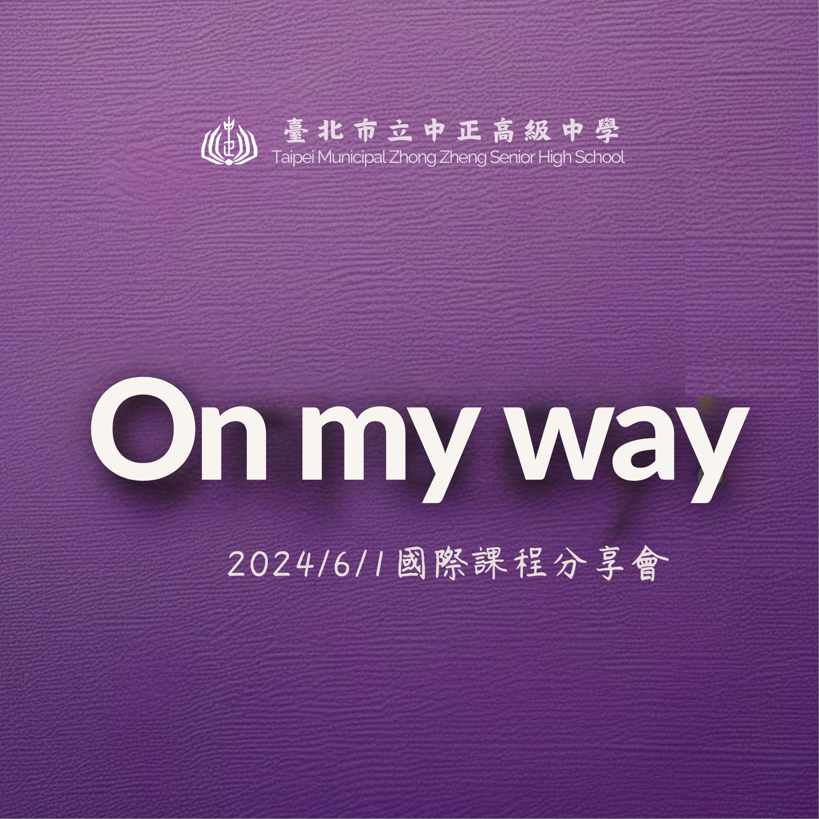 臺北市立中正高中將於2024年6月1日於華山1914 文化創意產業園區西5-1館舉辦「國際及特色課程學習分享會」以On My Way為主題,展示國際及特色課程學生如何將所學運用於生活之中,並呈現師生如何在教學歷程中掌握學業品格之成就。本活動將於上午11點30分開始,熱情邀請對本校國際及特色課程有興趣之學生、家長及教師一同參與。