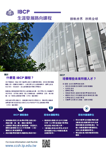 1.校訂必修,反思專案(RP)課程自主學習至少50小時 2..校訂必修,服務學習(Service learning) 課程自主學習至少50小時 3.校訂必修,語言發展(Language Development)自主學習至少50小時 |