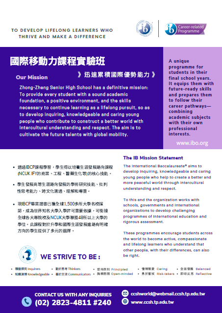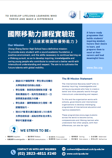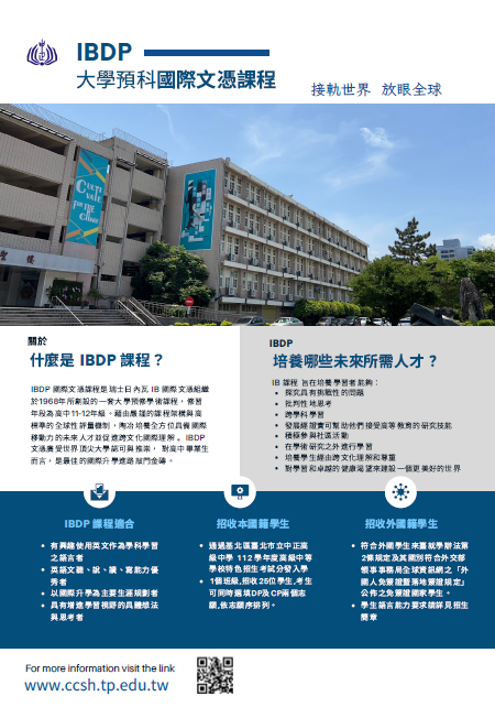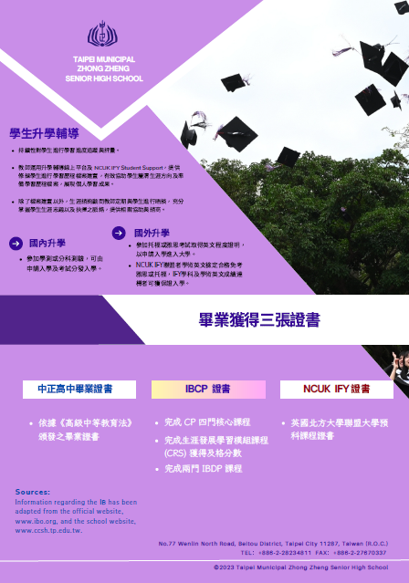 1.本校證書-同12年國教,將DP課程視為必修學分 2.IB證書-獲得六門學科IB考試成績至少 24 分或平均四分 (或C)。並且高級科目中獲得至少12分、標準水平科目中獲得至少 9 分。此外,必須完成EE、CAS 和TOK的所有要求。 |