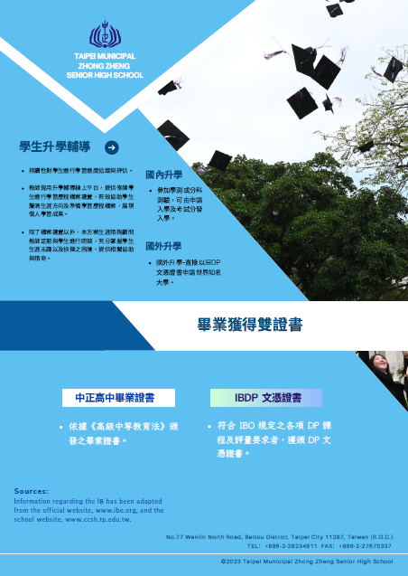 學生可依據我國高級中等學校學生學習評量辦法及其相關規定取得本校畢業證書之外,依據IBO之學生評量規定可獲得IBCP認證或IBDP國際文憑。