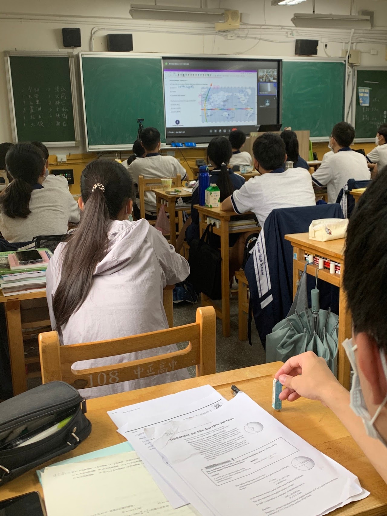 本校與澳洲姊妹校Moreton Bay合作的線上教學系列課程涵蓋不同主題,第一次課程的主題為Distances on the Earth’s Surface,外師Brendan Miles以世界地圖和地球透視圖引導學生依據座標計算兩座城市的距離,除了詳述數學計算的公式,也使用講義習題讓學生進行實際的計算演練。