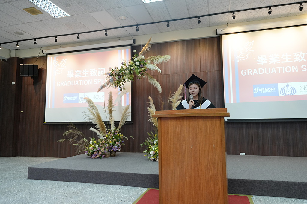 典禮開始,所有畢業生穿著正式畢業服裝入場,興奮與期待的心情溢於言表,家長也忙著捕捉這值得紀念的時刻。接著,師長們依序致詞為孩子們送上殷切的期許與祝福,學生代表們也發表了精彩的英文演說,以幽默風趣的口吻,述說參與國際課程一路走來的辛苦與成就感,贏得現場熱烈的掌聲。