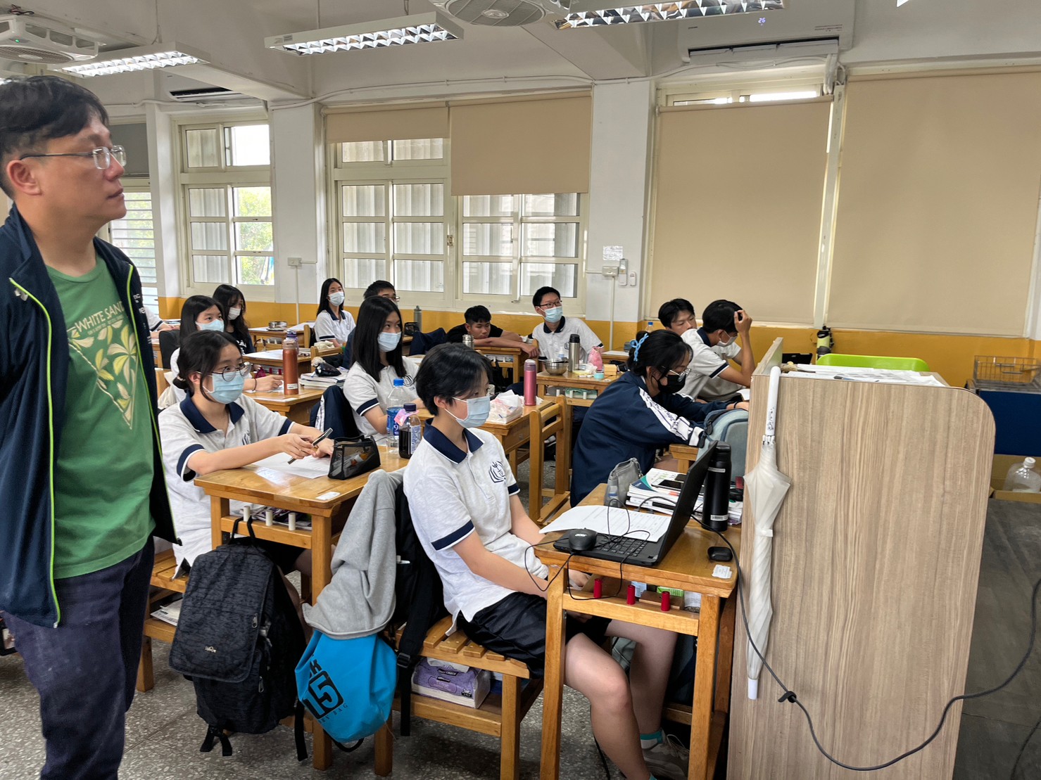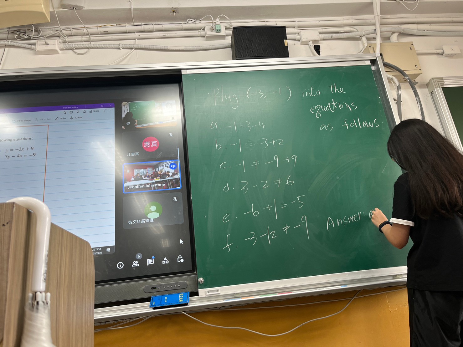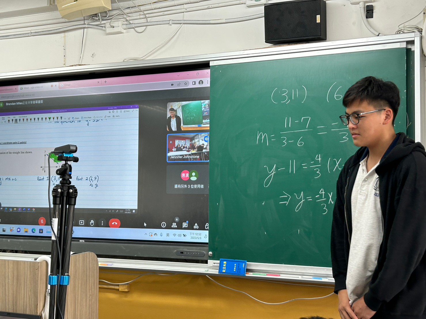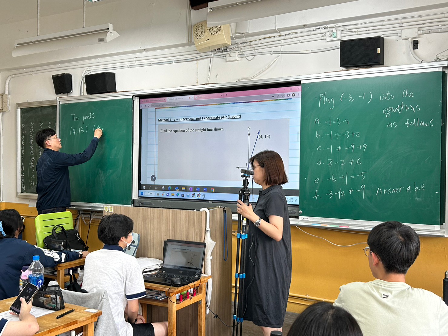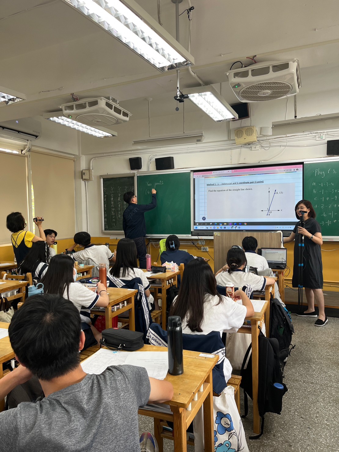 本次數學合作教學由澳洲的Brendan Miles老師引導Linear Regression (線性回歸) 的觀念與演算法,本校鄧宇凱老師進行協同教學。參與的中正高中118雙語實驗班同學能夠即時回應Brendan老師所出的演算題,並迅速在黑板上寫出解題過程,顯示出對於數學公式已駕輕就熟。