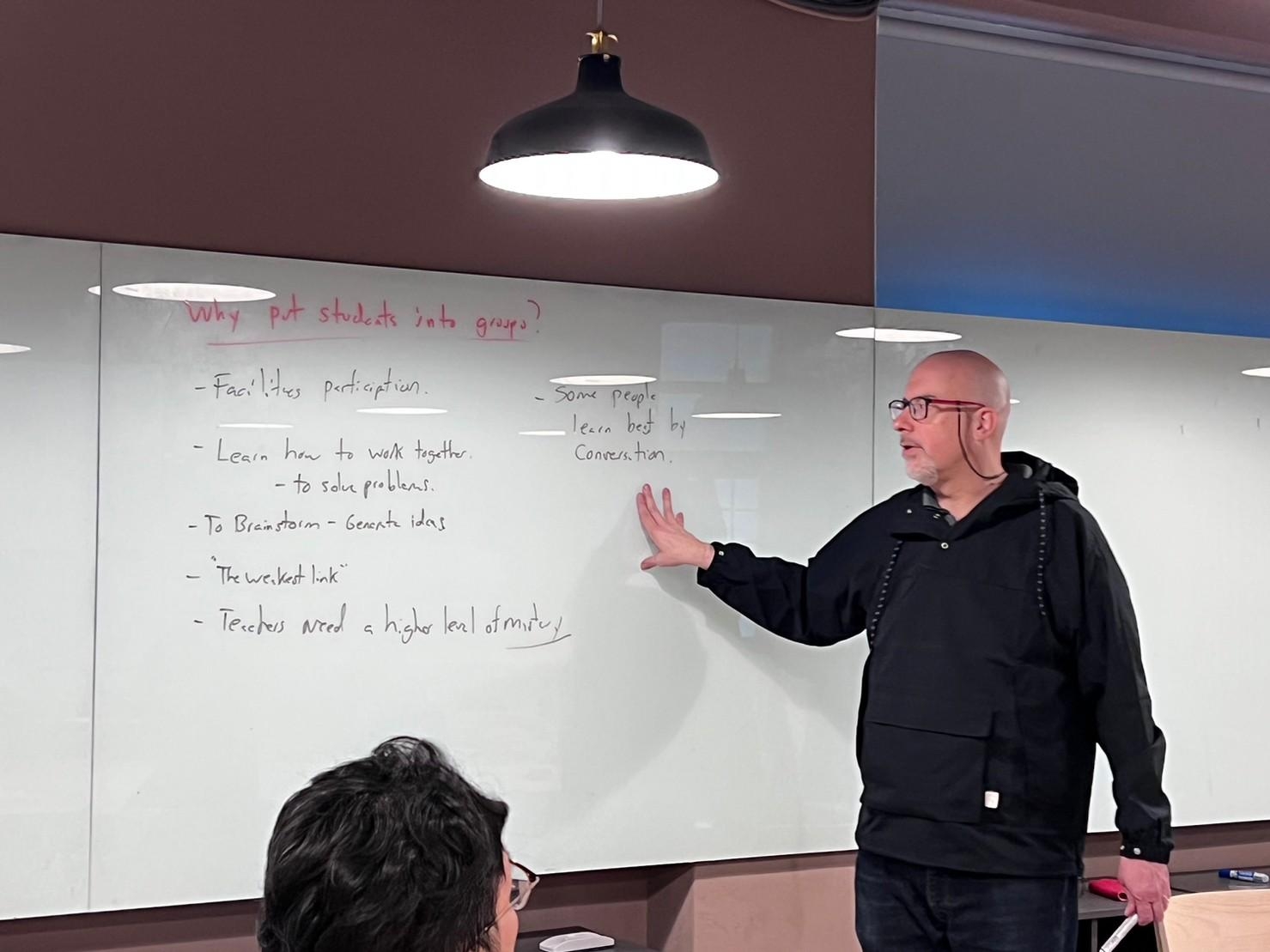 3/13研習活動由來自美國Fairmont School的Jon老師分享分組的好處:透過差異化分組、或同等能力分組,促進學生的學習力。此外,教師認同差異化的學習風格,學生可以獨立研讀、或與他人交談共讀的方式,目的在學習歷程中有機會獲得更多,讓學習成果更佳。分組活動有其他好處:提高學生參與感、學生與他人的共事中有利於解決問題、有利於腦力激盪產生好點子。