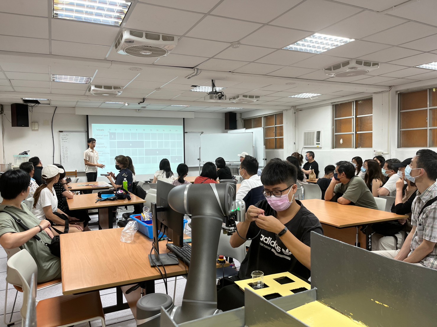 學生部分則首先進行國際特色課程學習體驗(全英語),由高瑋謙老師與外師帶領,與學生進行全英語互動並進行小遊戲,過程十分有趣,學生也反應活躍。而後再到地理教室進行人工智慧AI課程,由本校學長向參訪學生分享達明機器人手臂運用之設計整體過程,內容詳盡,並透過實際操作機械手臂,讓參訪學生初步了解AI的原理與運作。最後回到情境教室進行校訂必修課程體驗「數一數二:轉角遇見喬治」,同樣由本校學長進行分享,由於時間已近活動結束尾聲,該課程體驗由許孝誠主任重點提問,配合學長的簡報分享,使參與學生能夠準確了解該課程的精神與內容。